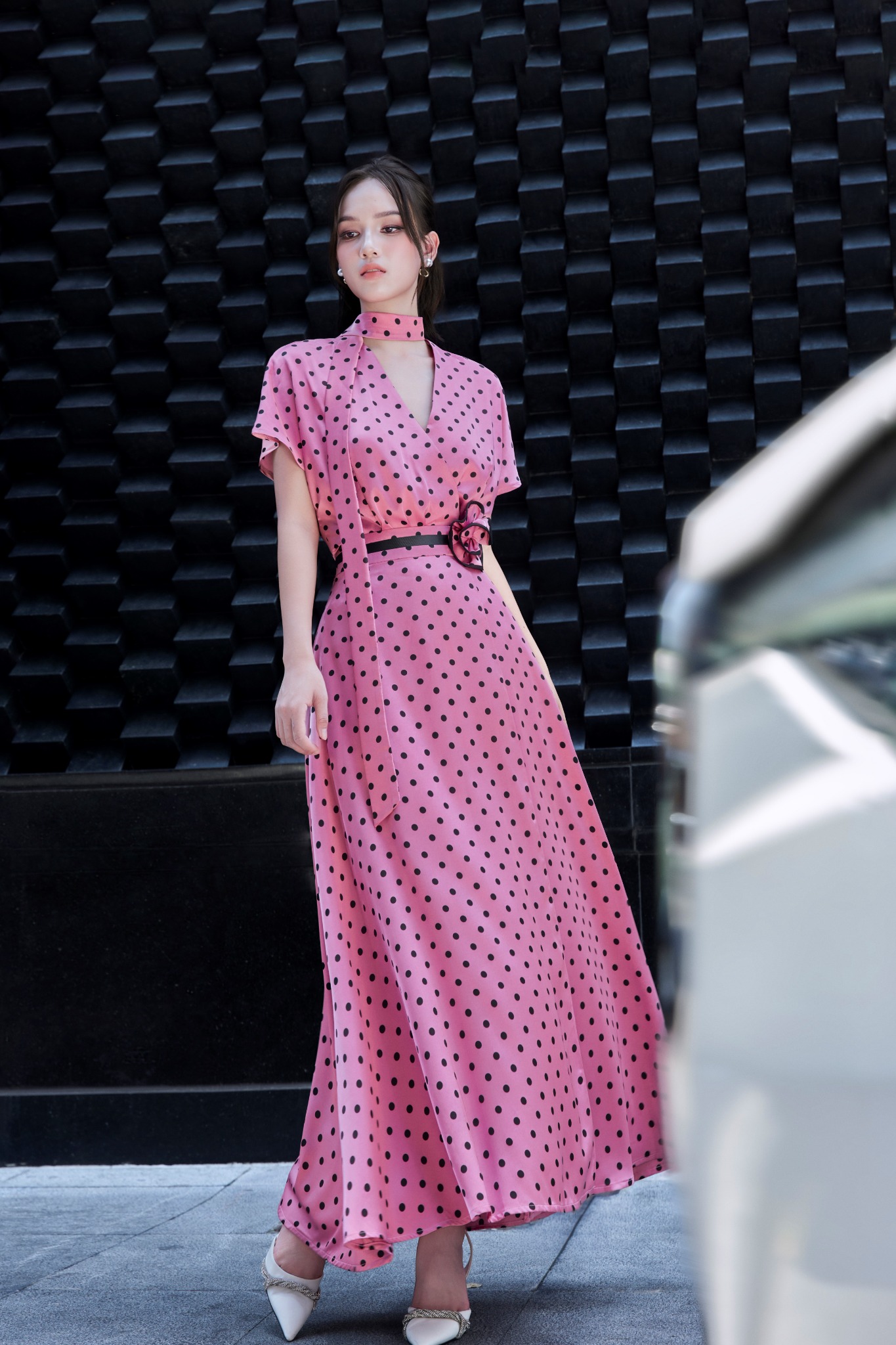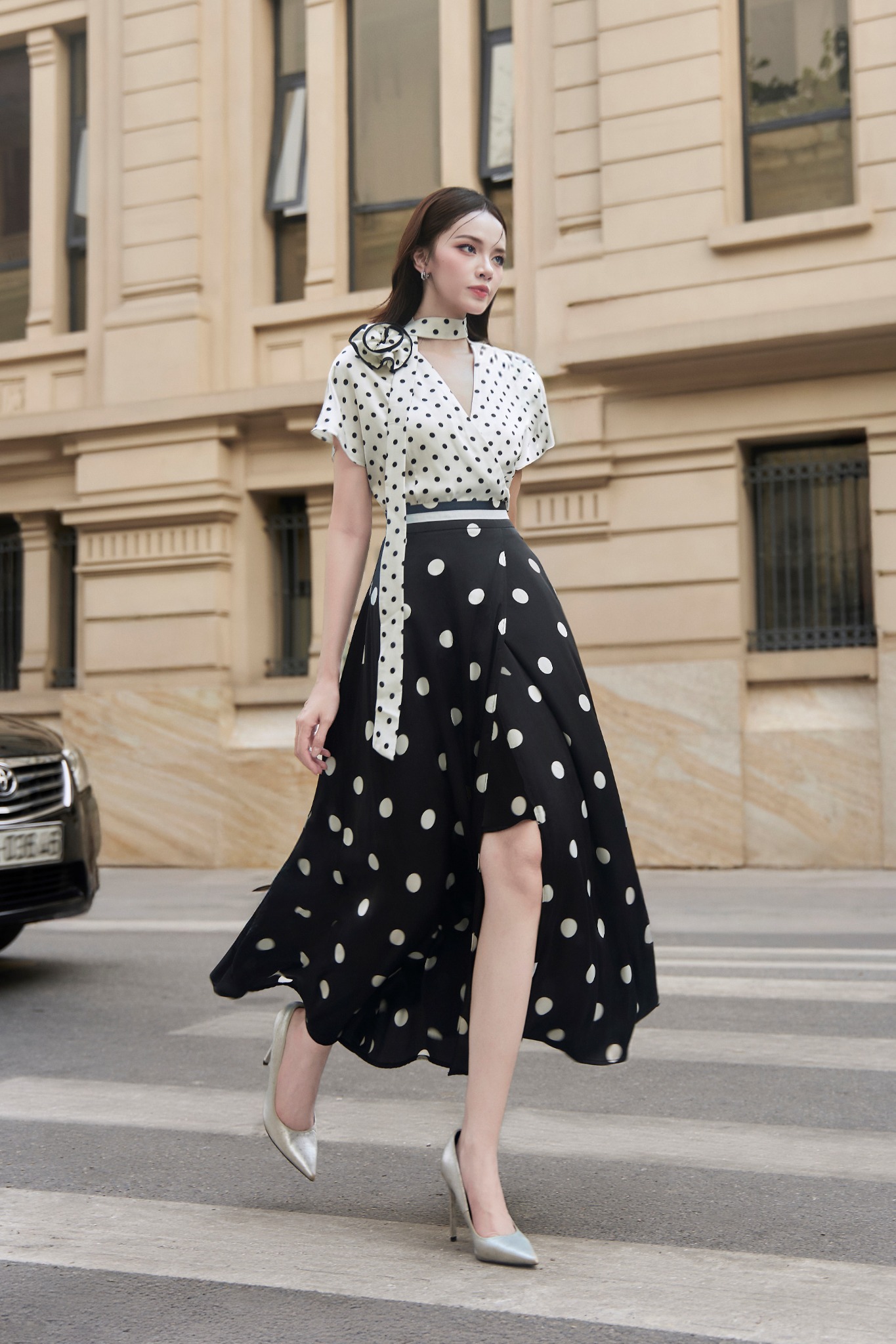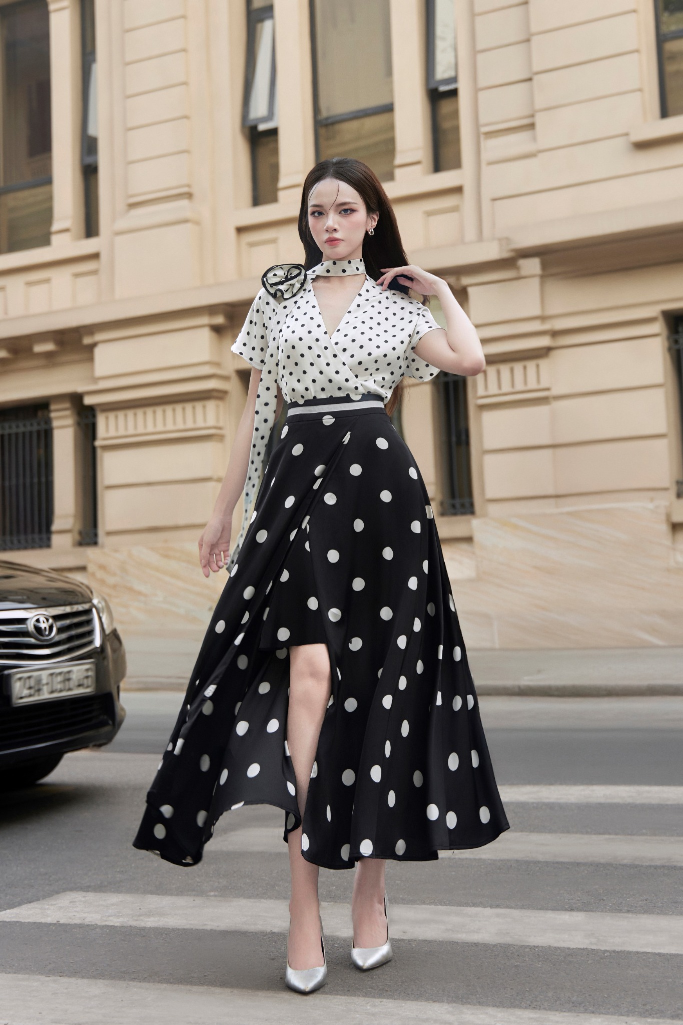 Thiết kế áo lụa với họa tiết chấm bi nhuyễn, cổ áo được tạo dáng tim cùng tay áo ngắn được nối liền.