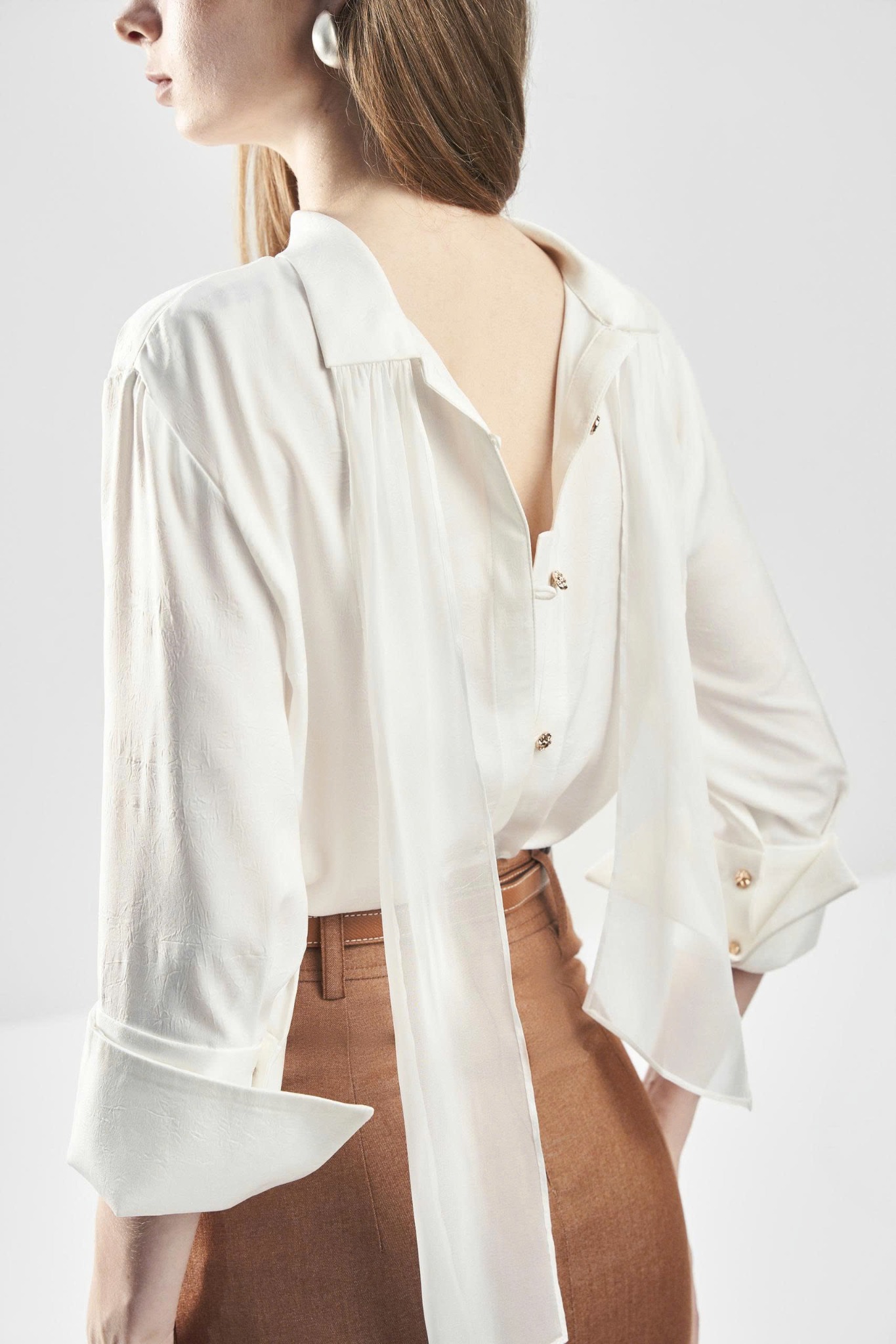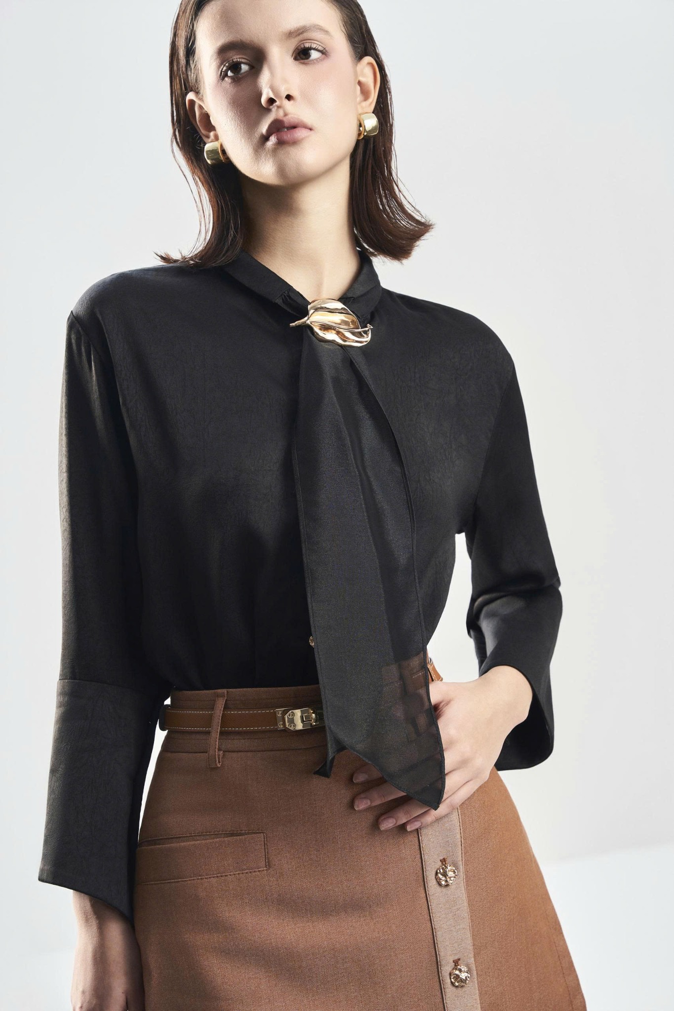 Áo Blouse Cách Điệu Cổ Áo thiết kế cổ 2 trong 1 với lựa chọn cổ giếng hoặc cổ buộc nơ, tạo sự linh hoạt và đa dạng phong cách. Tay dài măng séc mang lại phom gọn và thanh lịch, dễ phối trong nhiều dịp.