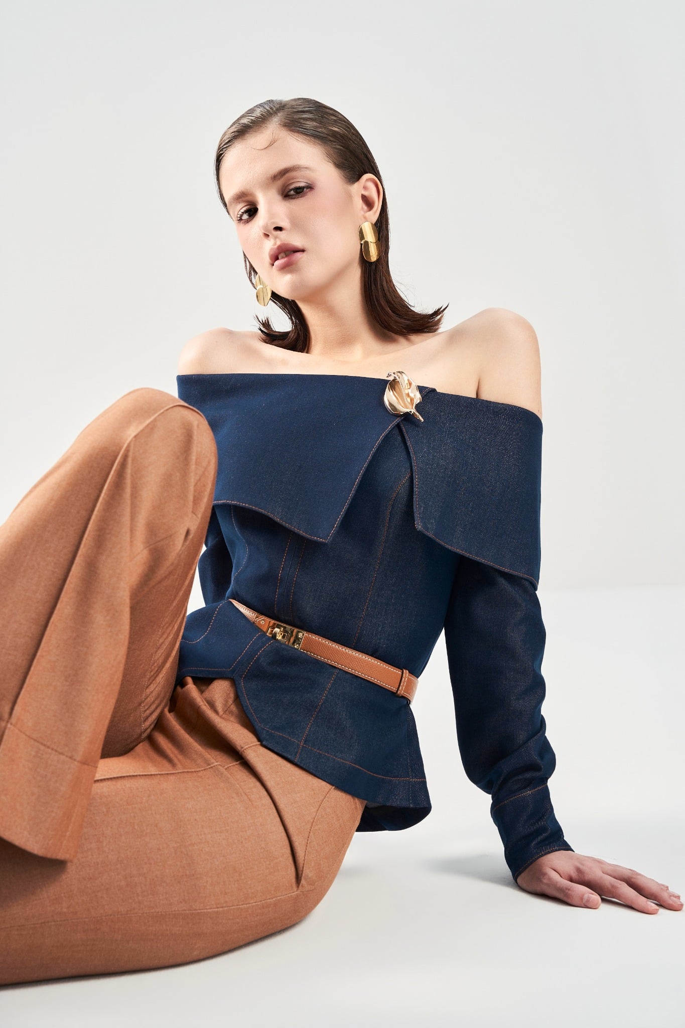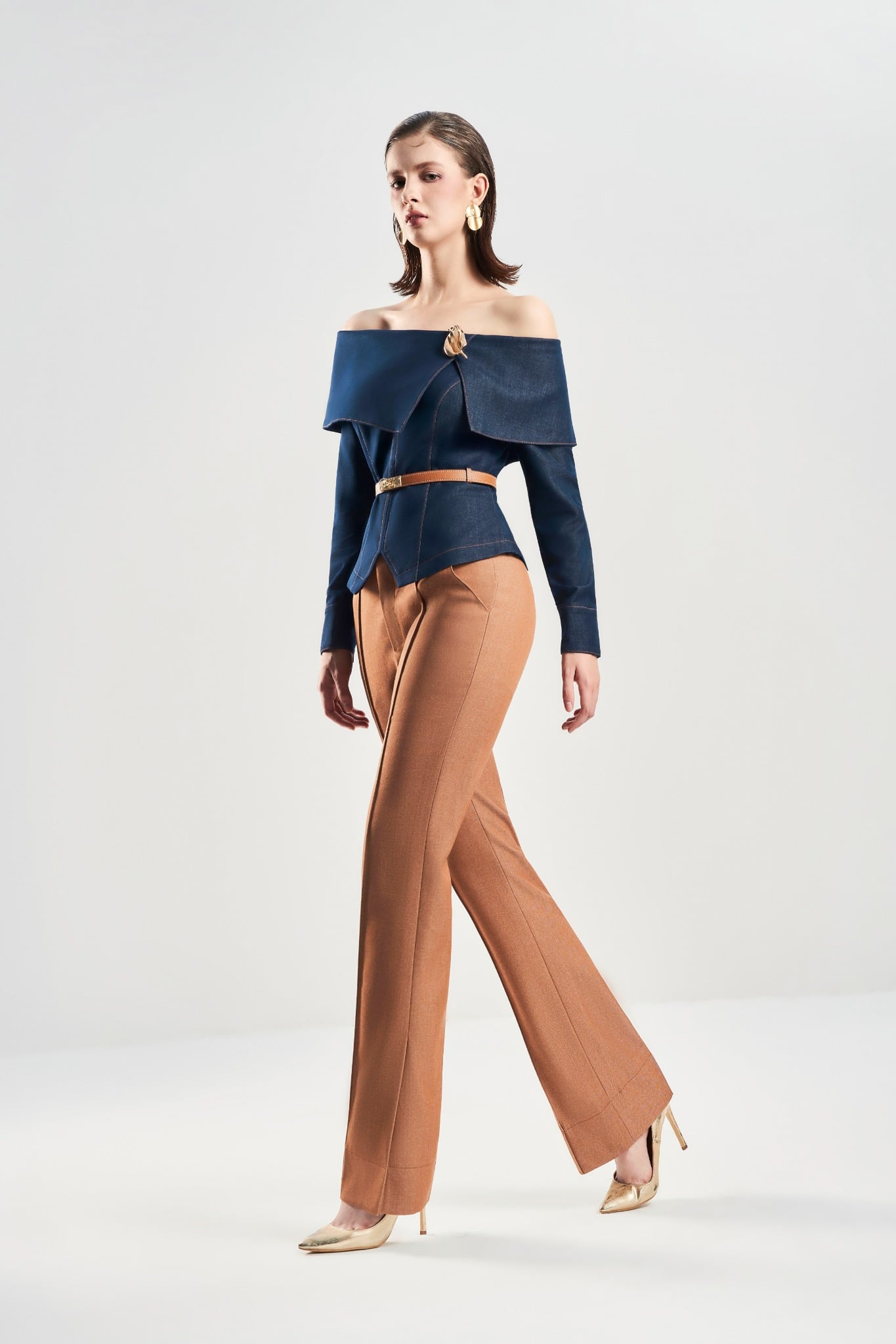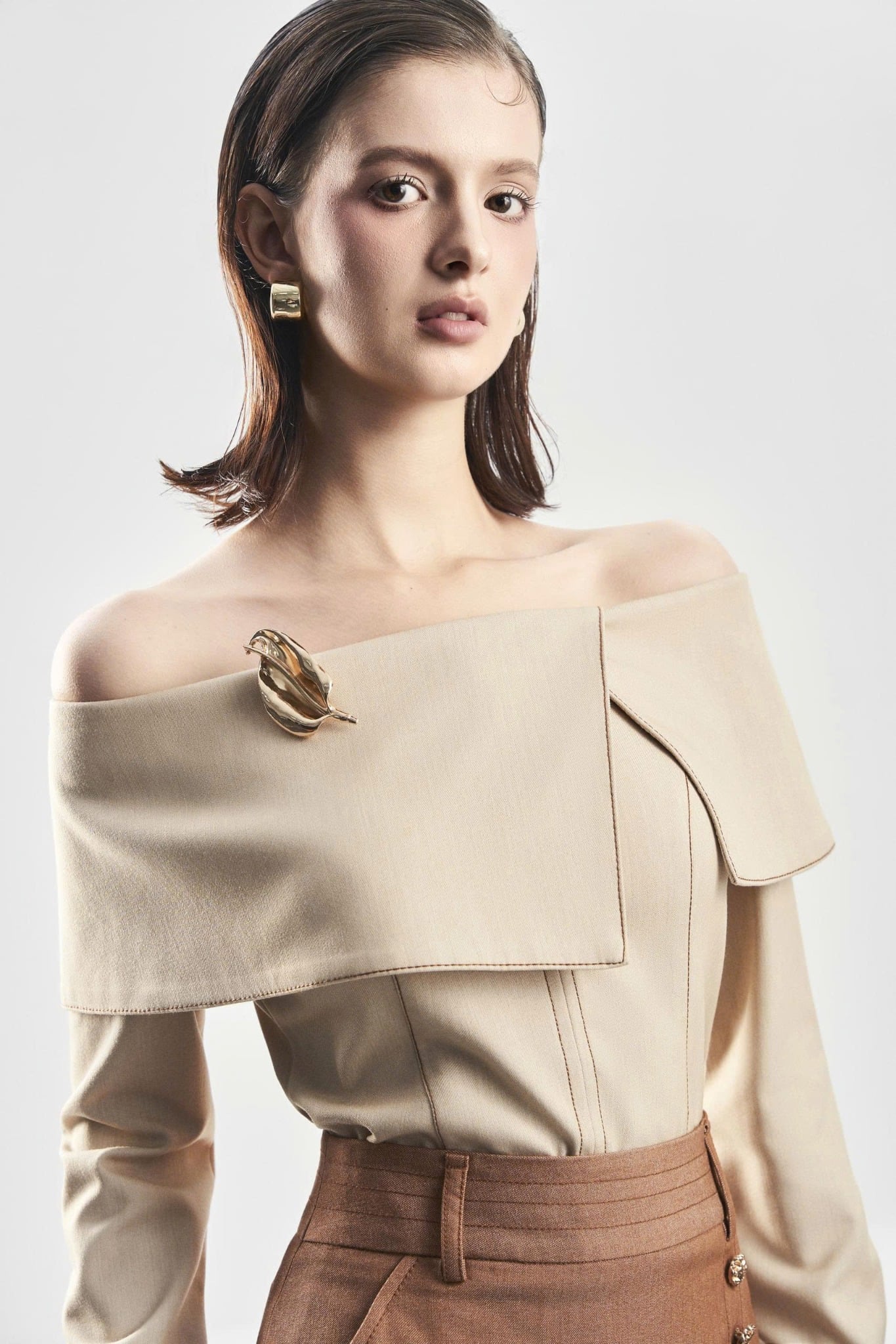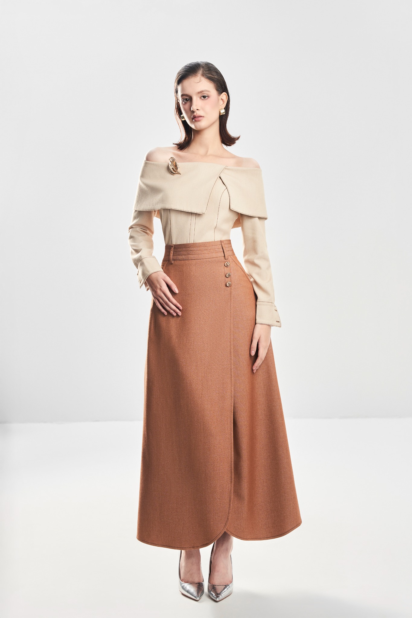 Áo trễ vai tay dài với chi tiết xếp ly mang lại độ mềm và điểm nhấn nữ tính. Phần mang xét tạo dáng gọn và ôm nhẹ cơ thể. Thân trước 2 lớp giúp phom đứng, thân sau 1 lớp giữ độ thoáng. Hoàn thiện với khoá kéo sau kín đáo, dễ mặc và giữ dáng đẹp.