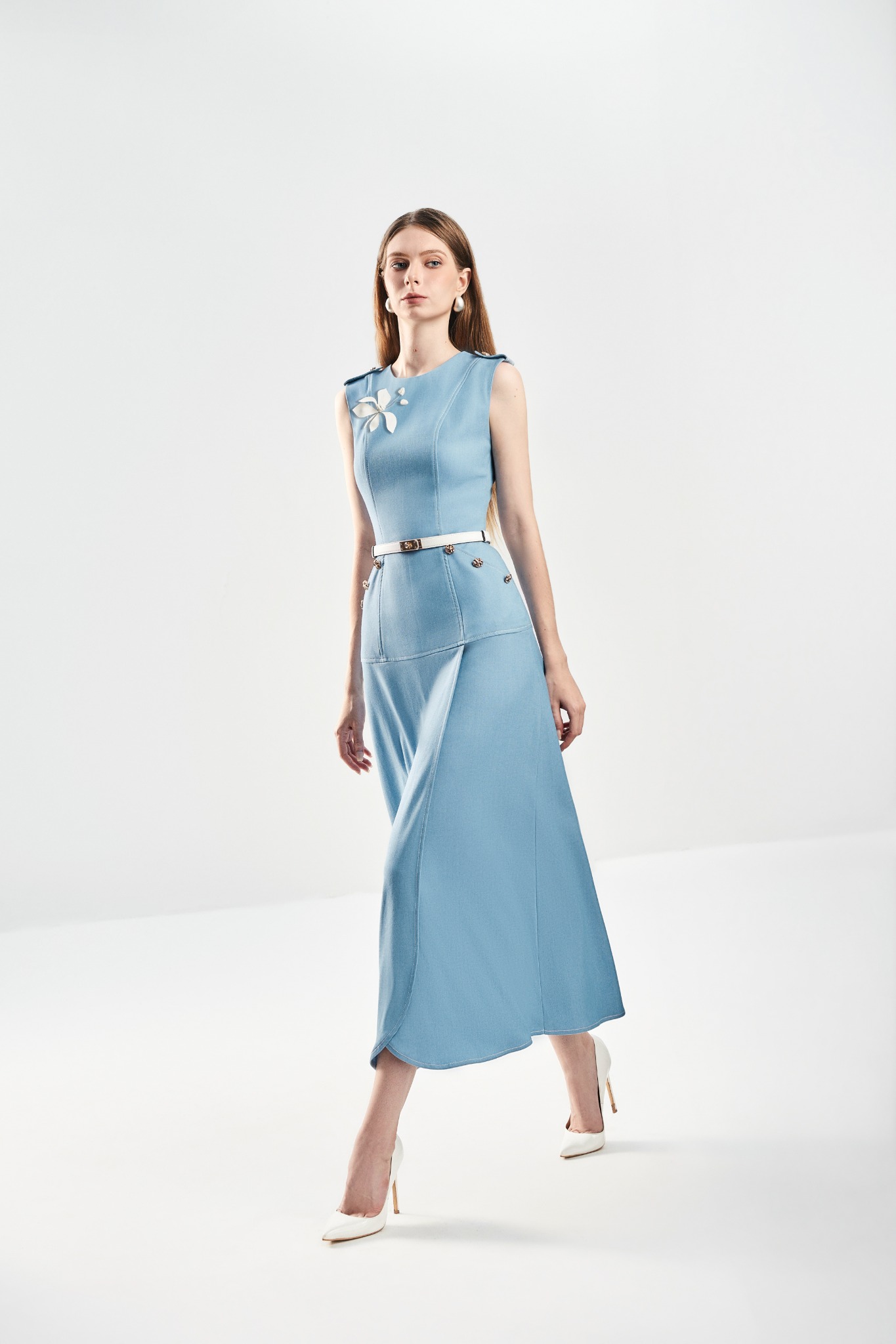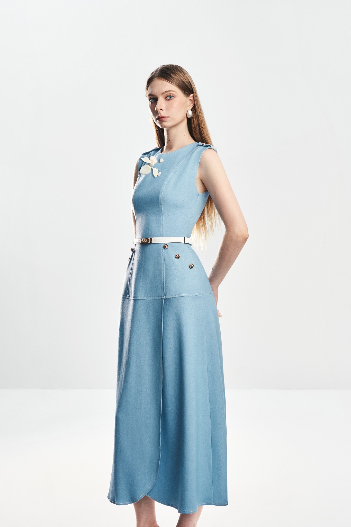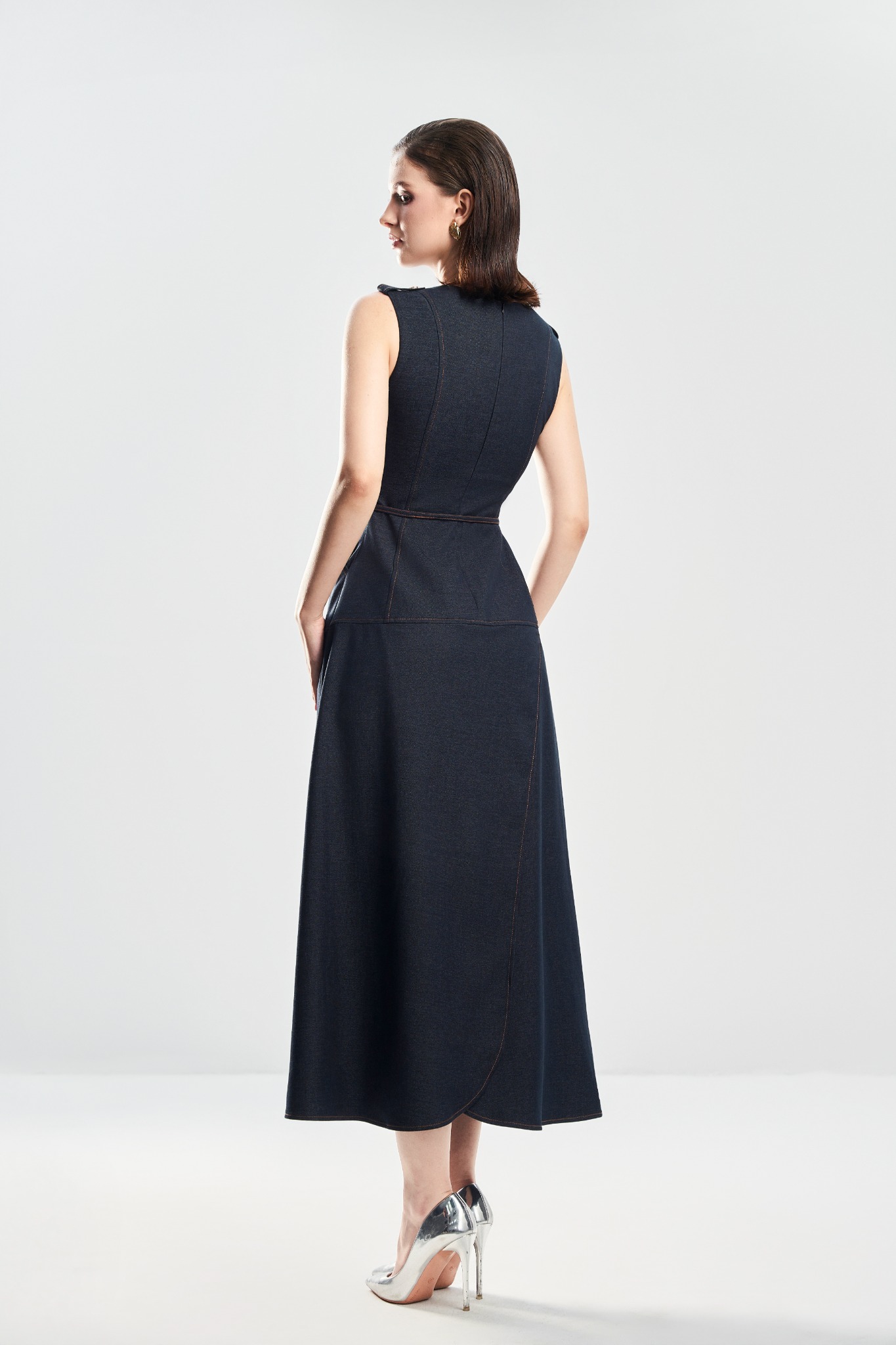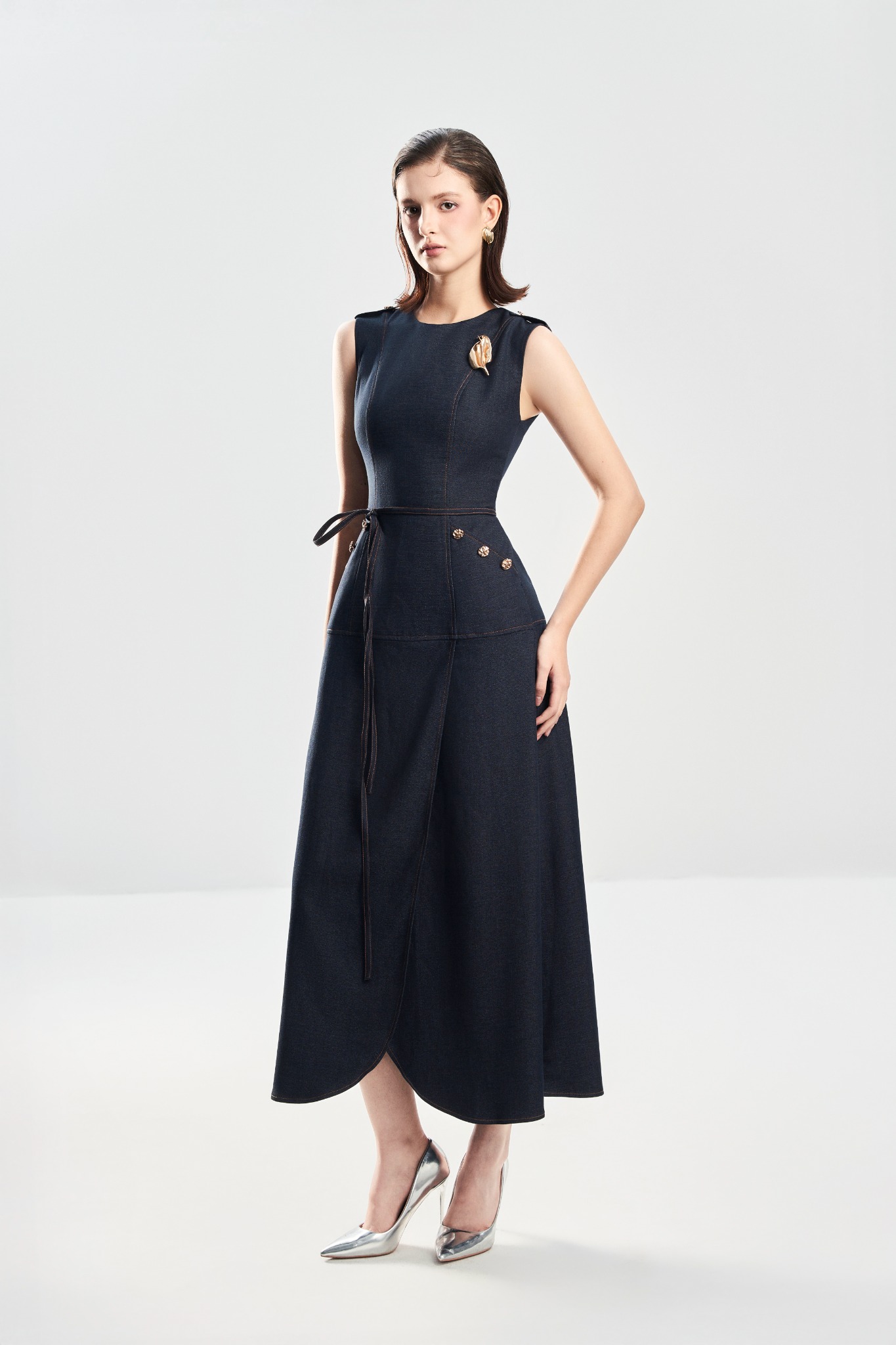 Đầm dáng A với cổ tròn sát nách và chi tiết đĩa vai tạo điểm nhấn gọn sắc. Hai túi chéo trước tăng tính ứng dụng, trong khi gấu lượn đắp trước–sau mang lại chuyển động mềm mại. Thiết kế 2 lớp giúp dáng đầm đứng form, hoàn thiện với khoá kéo sau kín đáo, dễ mặc và thoải mái.