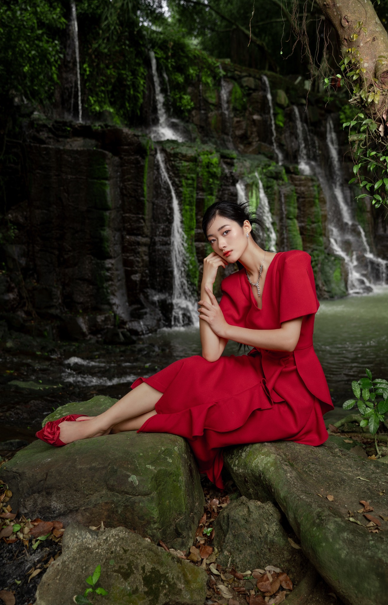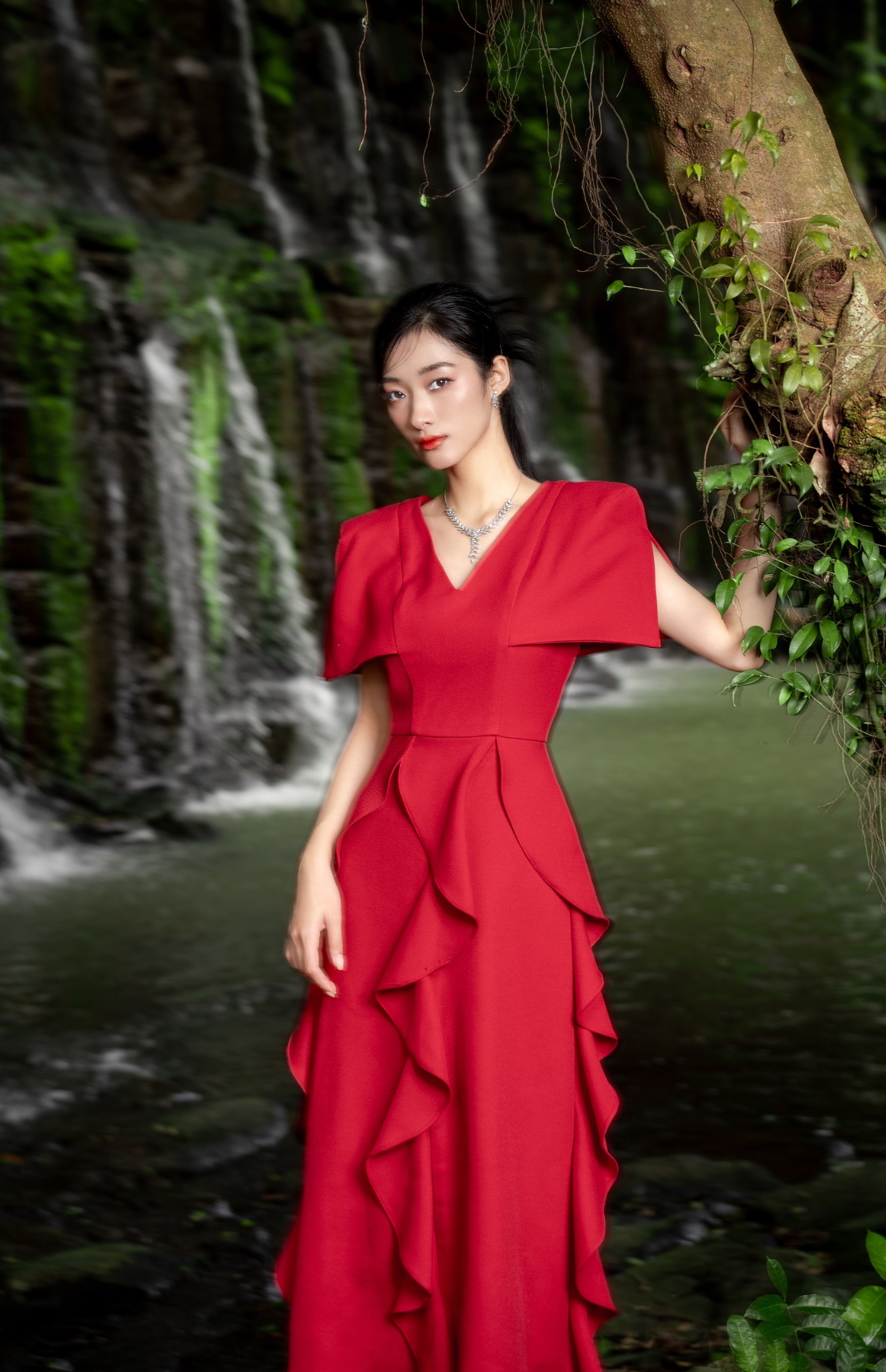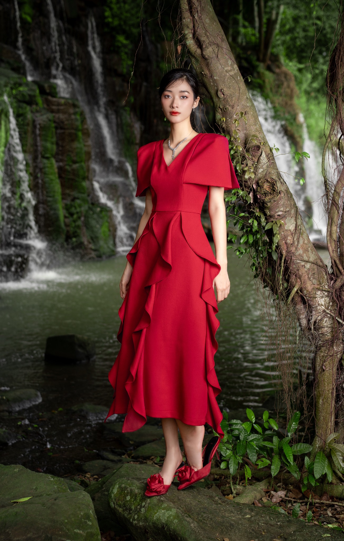 Dáng đầm midi form chữ A xòe nhẹ dài, được nhấn nhá những dải bèo sóng nước thêm phần thướt tha. Phần cổ chữ V yêu kiều nữ tính nhưng tổng thể thiết kế vẫn toát lên chất lịch duyệt trang trọng từ điểm nhấn cầu vai vuông.