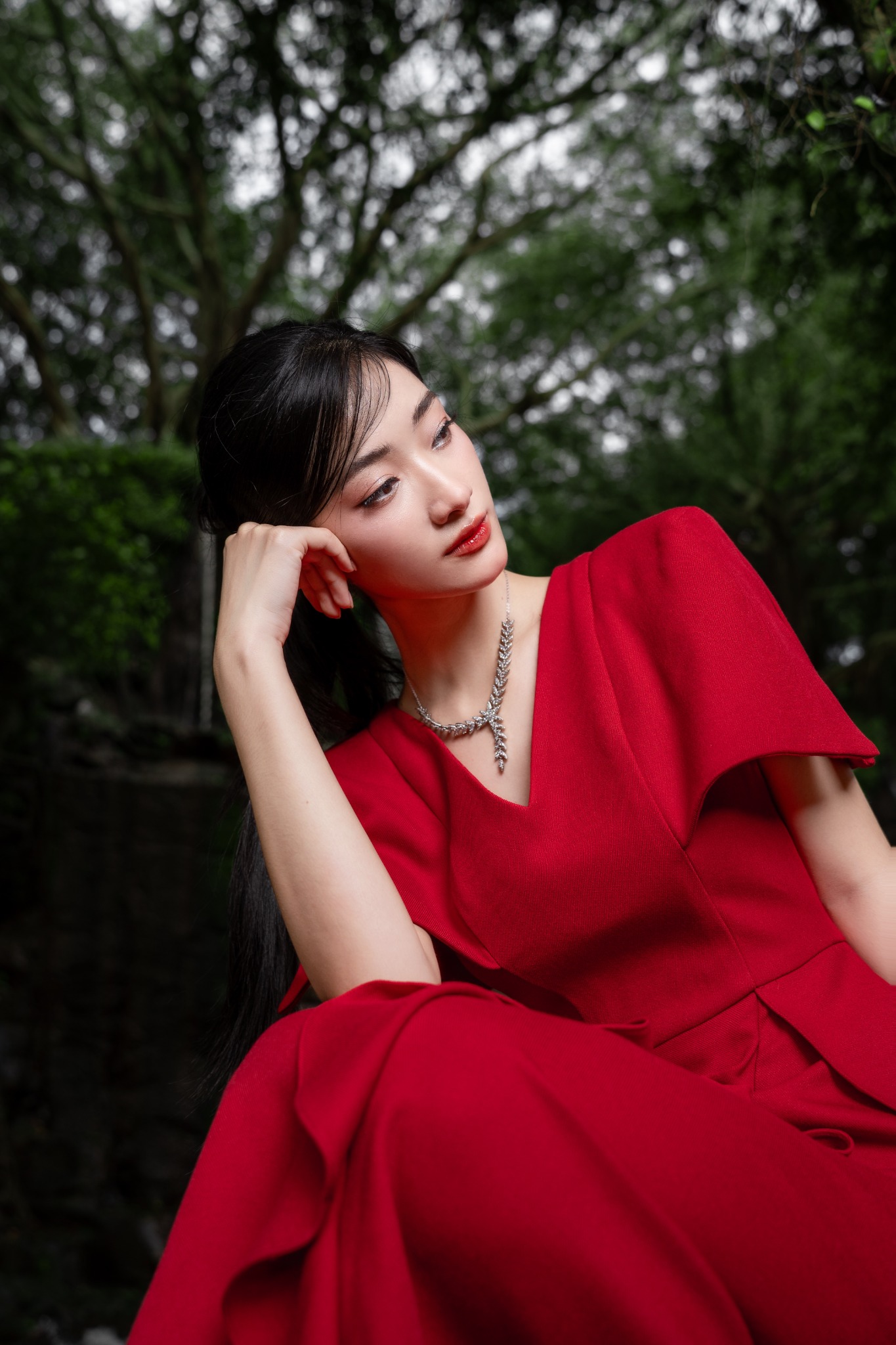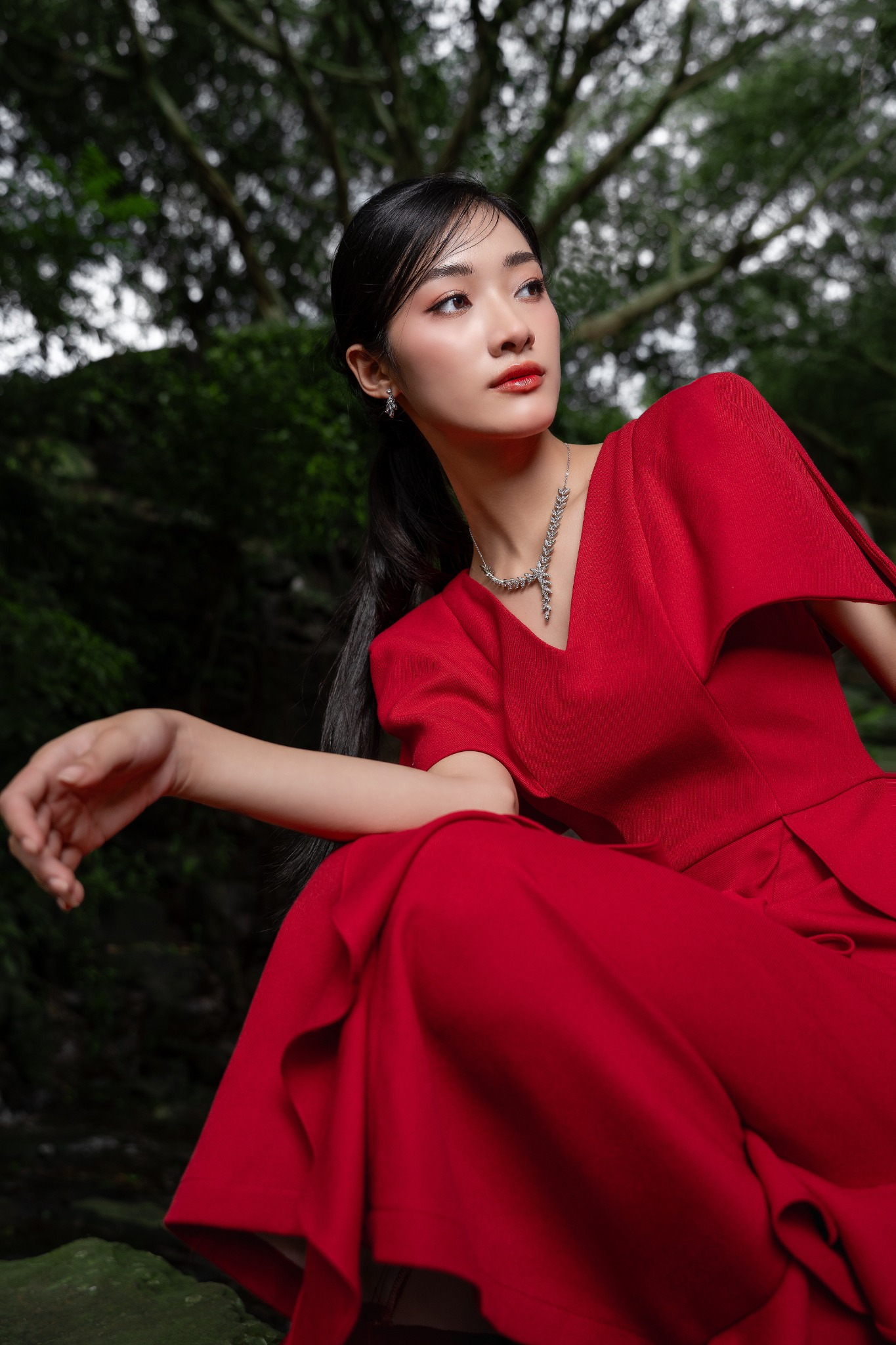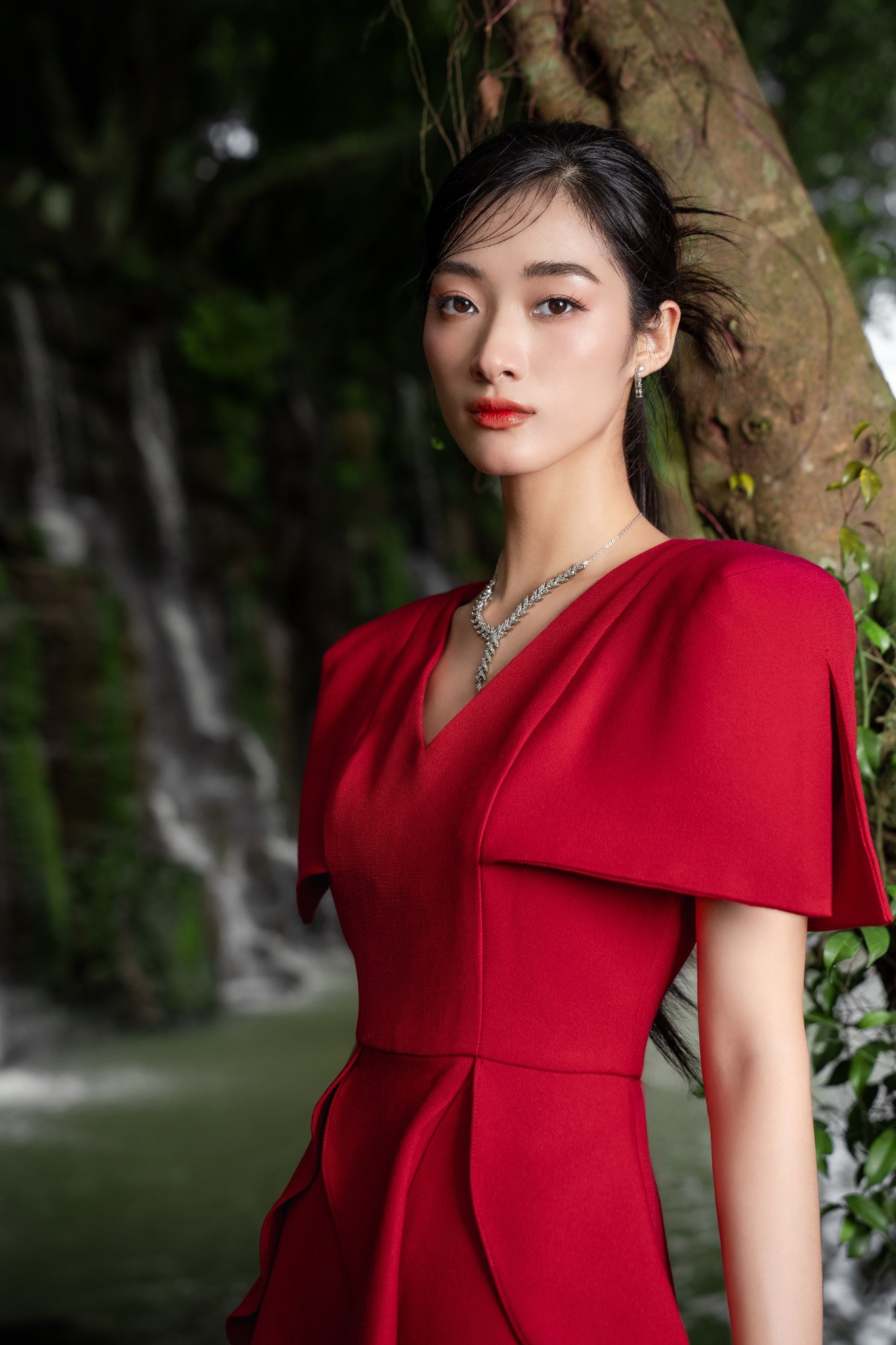 Dáng đầm midi form chữ A xòe nhẹ dài, được nhấn nhá những dải bèo sóng nước thêm phần thướt tha. Phần cổ chữ V yêu kiều nữ tính nhưng tổng thể thiết kế vẫn toát lên chất lịch duyệt trang trọng từ điểm nhấn cầu vai vuông.