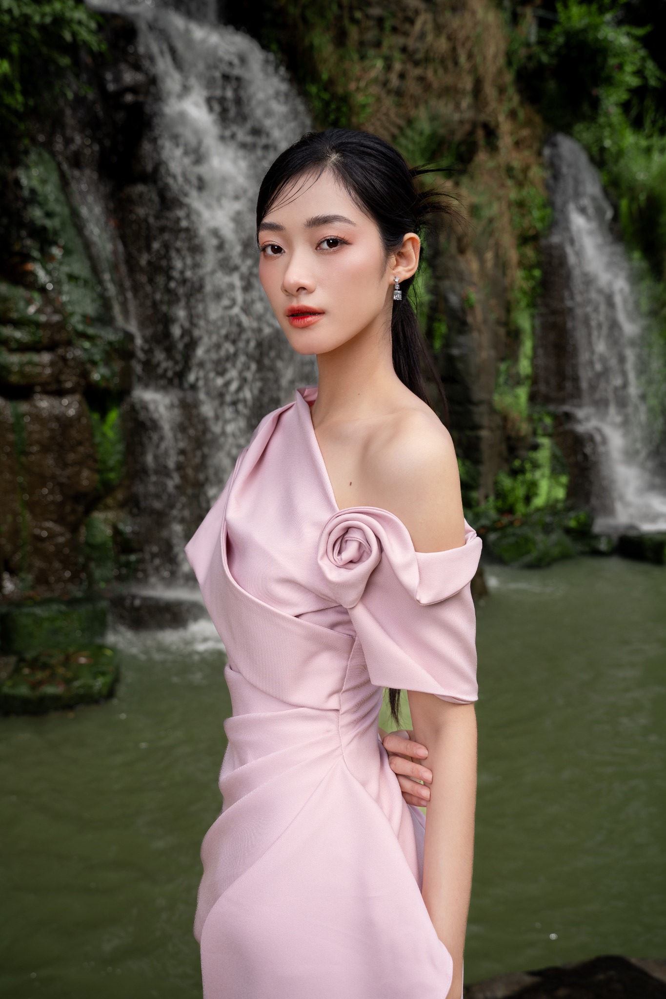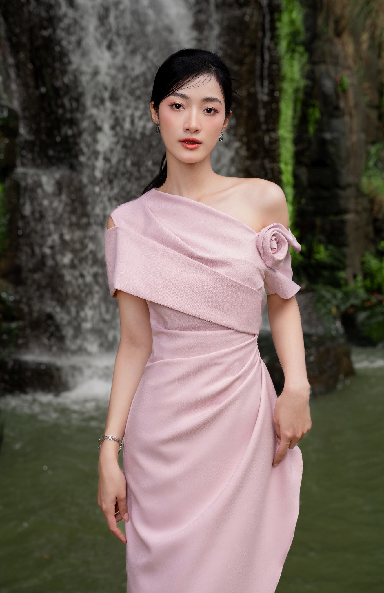 Chiếc đầm bút chì mang sắc hồng pastel nhẹ nhàng cùng điểm nhấn hoa nở 3D được tạo hình khéo léo bởi kỹ thuật draping, làm nổi bật thêm thiết kế lệch vai. Những đường xếp nếp được tạo dáng tự nhiên, vừa hack dáng tôn đường eo và vòng hông.