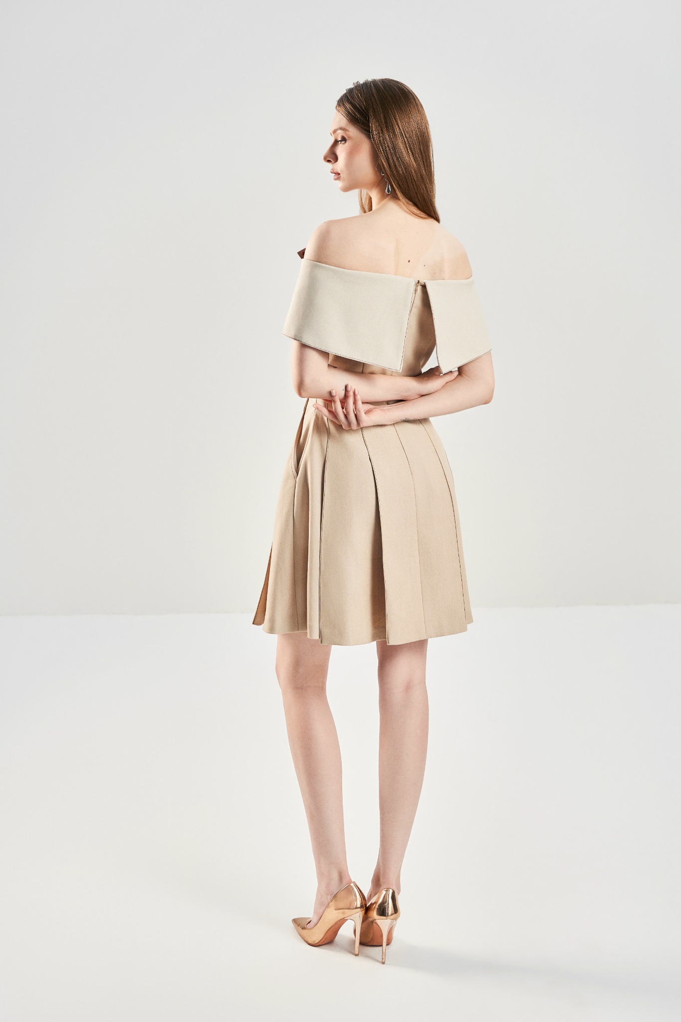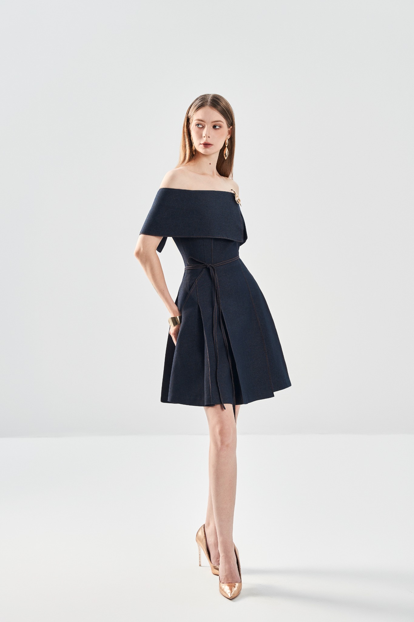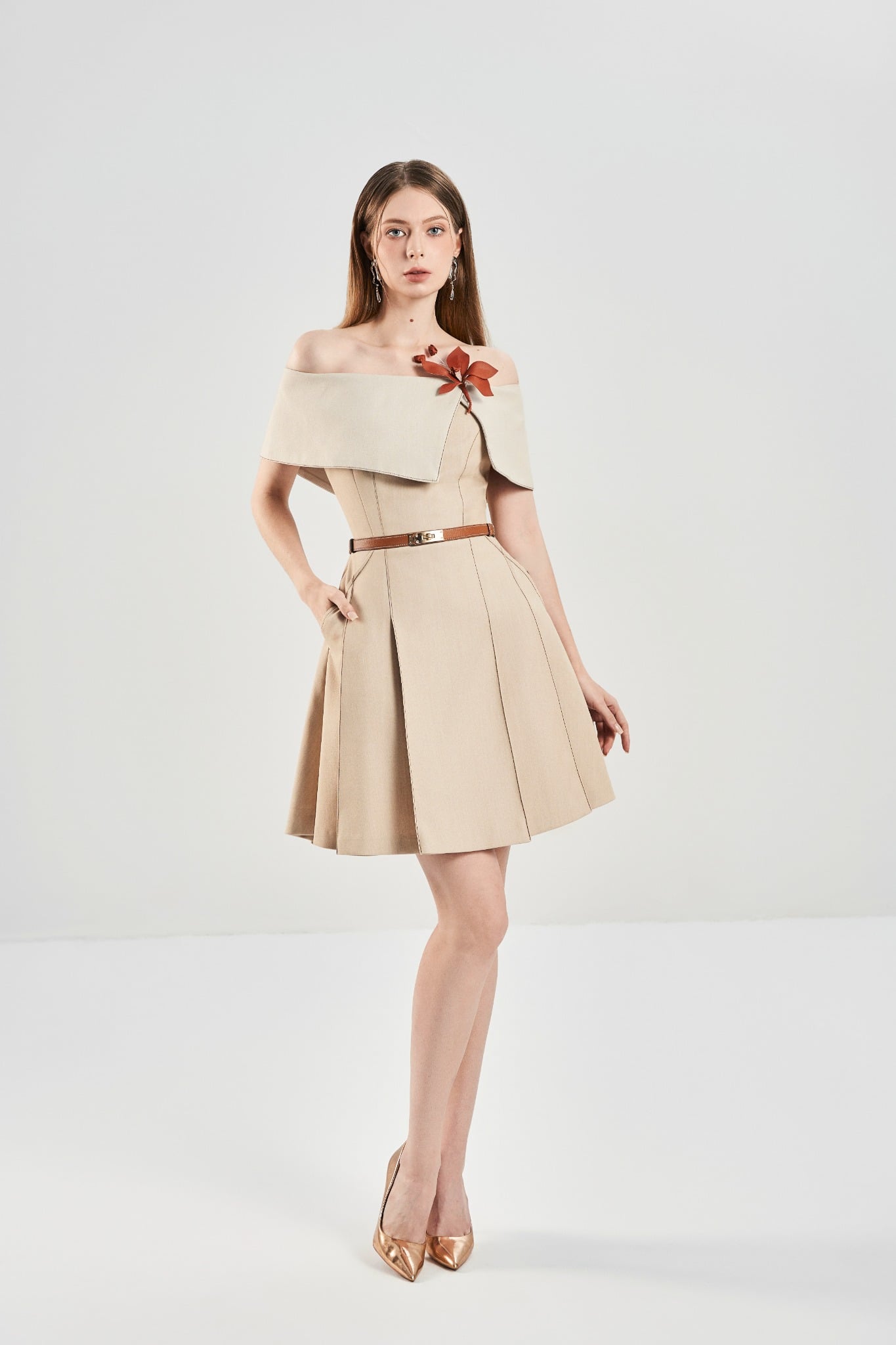 Đầm ôm trễ vai tôn đường vai cổ mềm mại, kết hợp phần thân dưới xếp ly trước – sau tạo hiệu ứng chuyển động tự nhiên. Hai túi chéo tăng tính ứng dụng, trong khi kết cấu 2 lớp mang lại phom dáng mượt và đứng dáng. Hoàn thiện với khoá kéo sau kín đáo, dễ mặc và giữ form gọn gàng.
