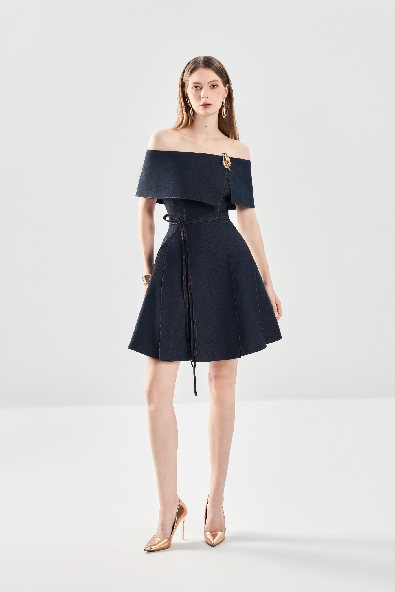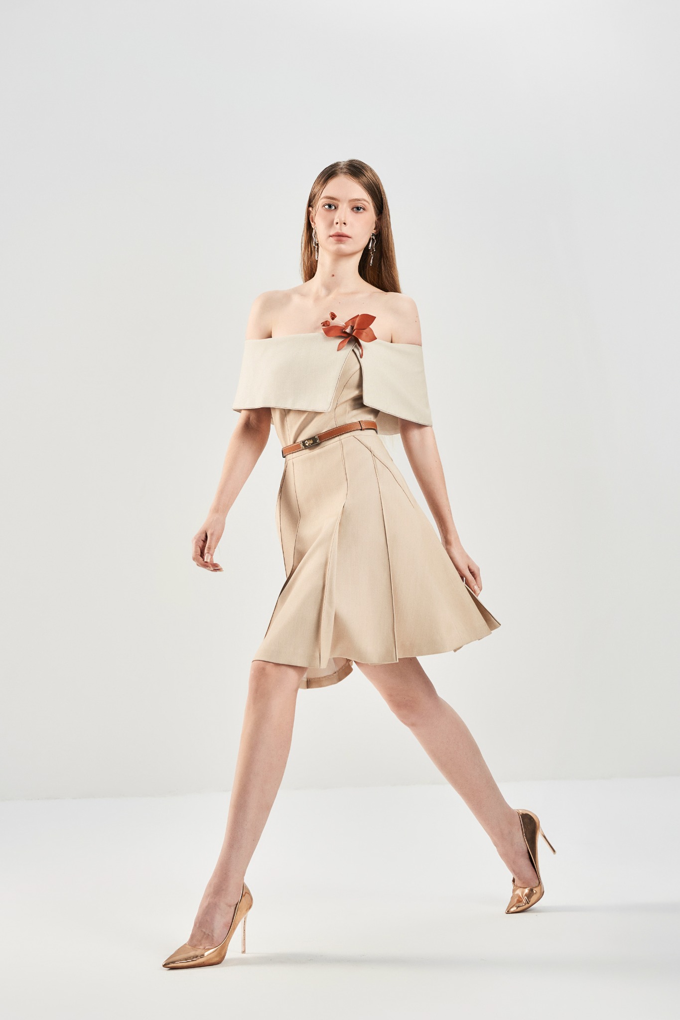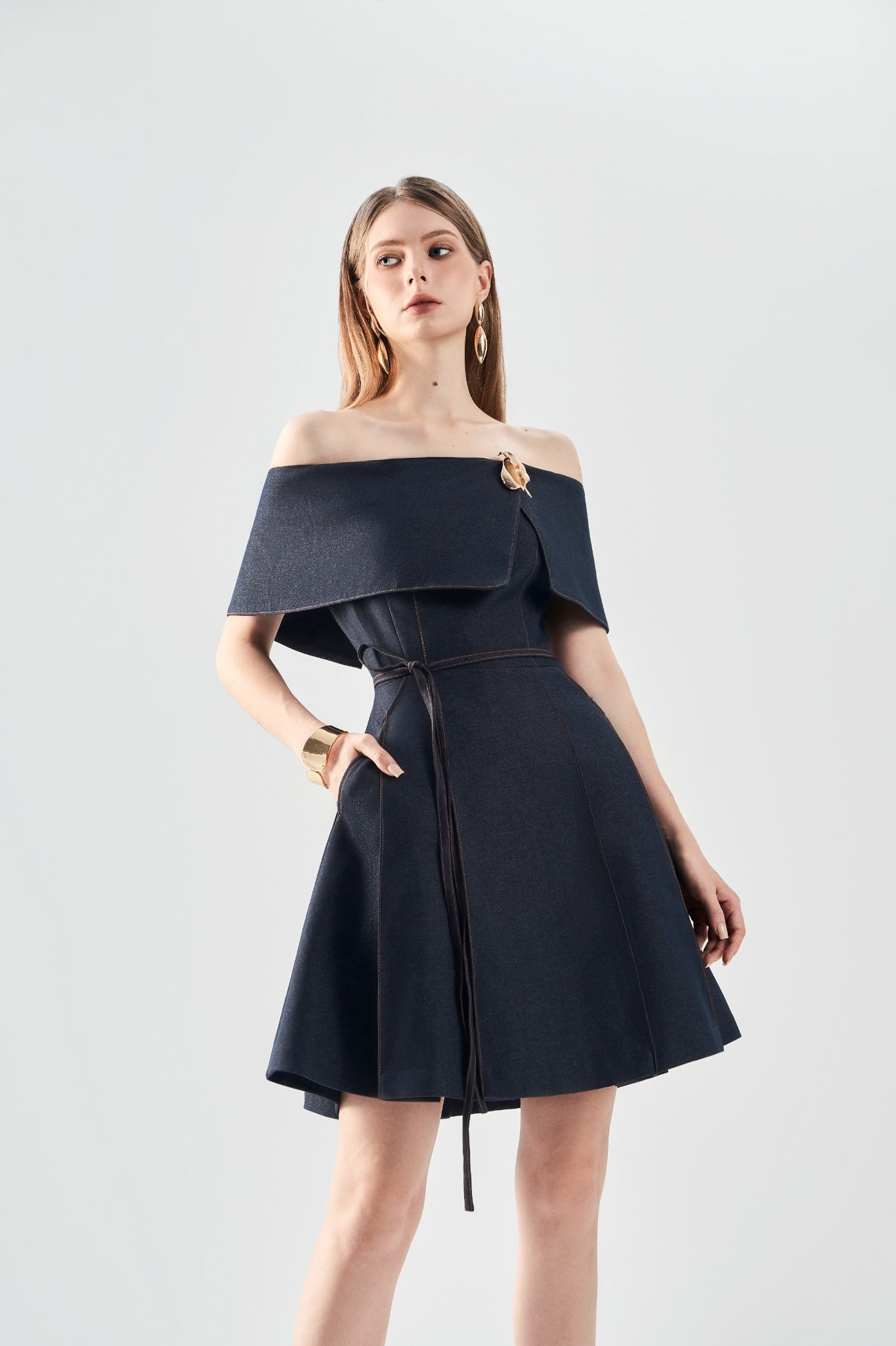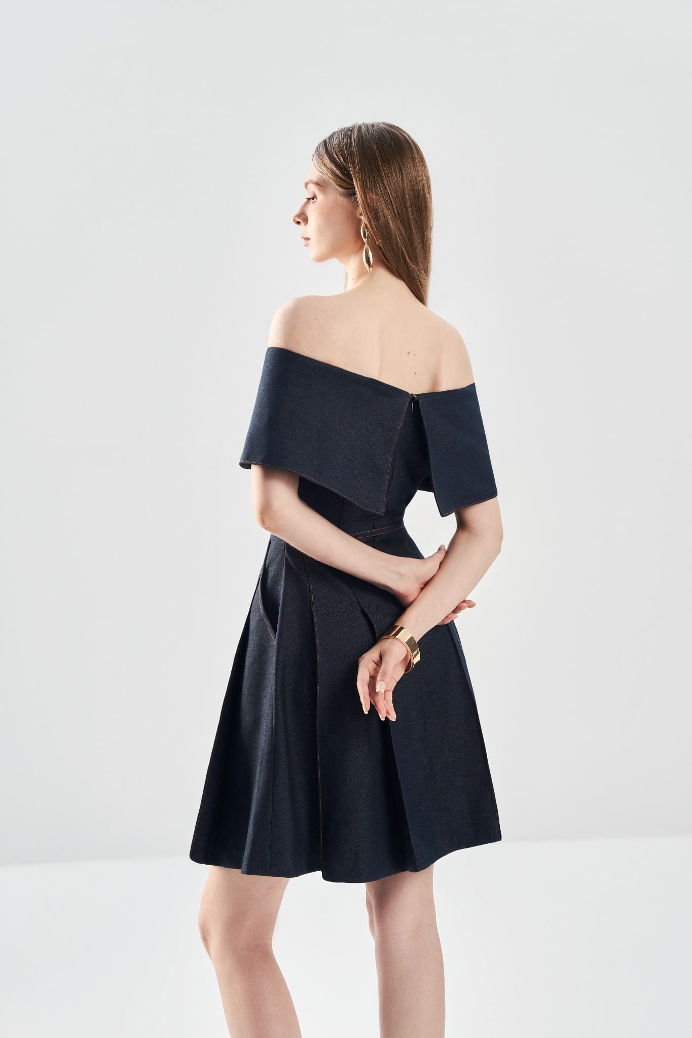 Đầm ôm trễ vai tôn đường vai cổ mềm mại, kết hợp phần thân dưới xếp ly trước – sau tạo hiệu ứng chuyển động tự nhiên. Hai túi chéo tăng tính ứng dụng, trong khi kết cấu 2 lớp mang lại phom dáng mượt và đứng dáng. Hoàn thiện với khoá kéo sau kín đáo, dễ mặc và giữ form gọn gàng.