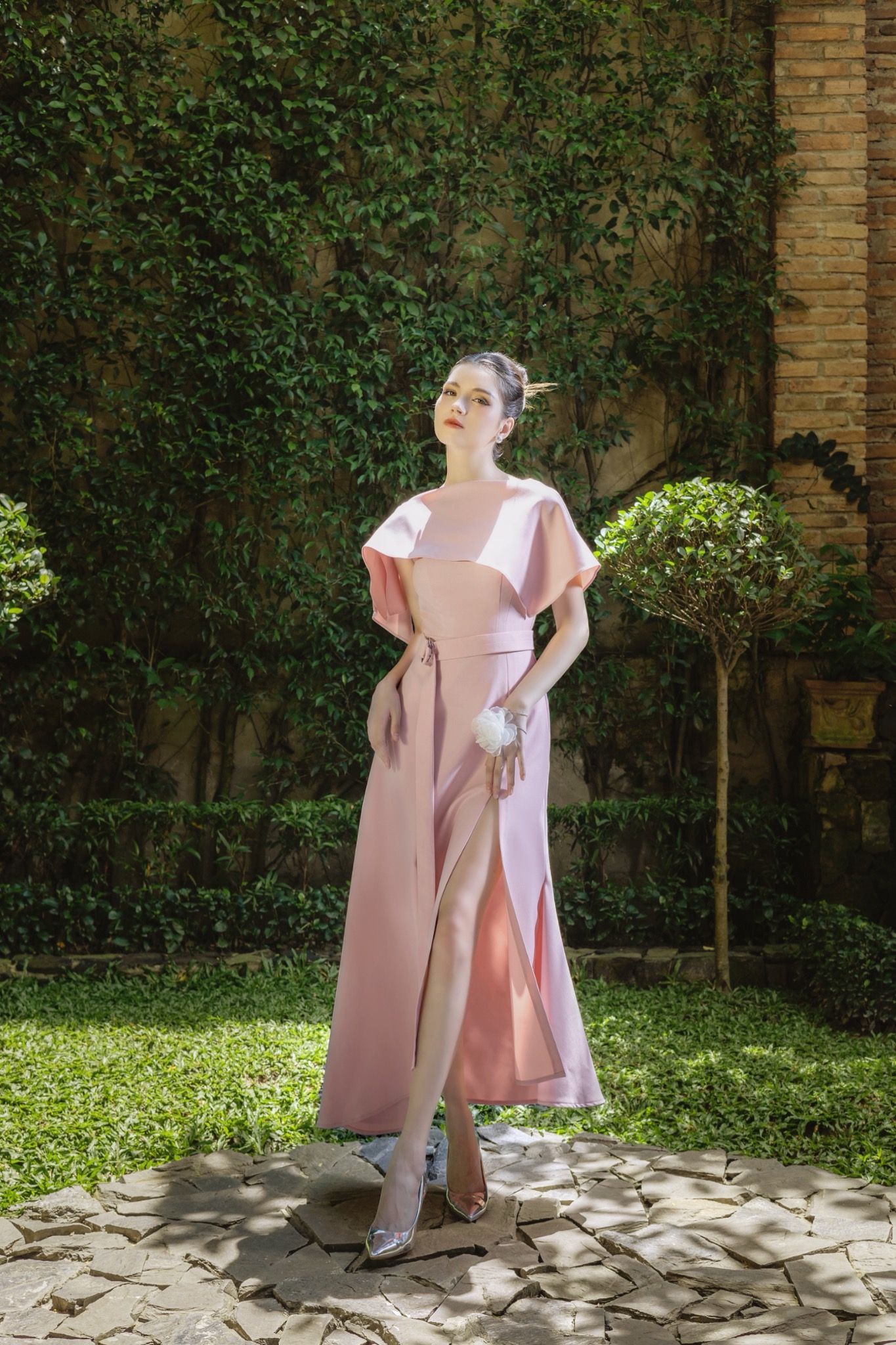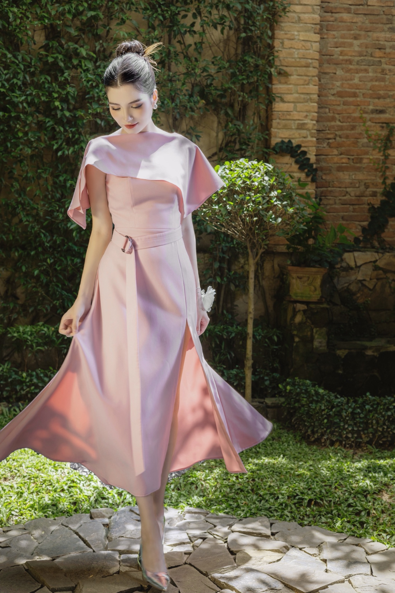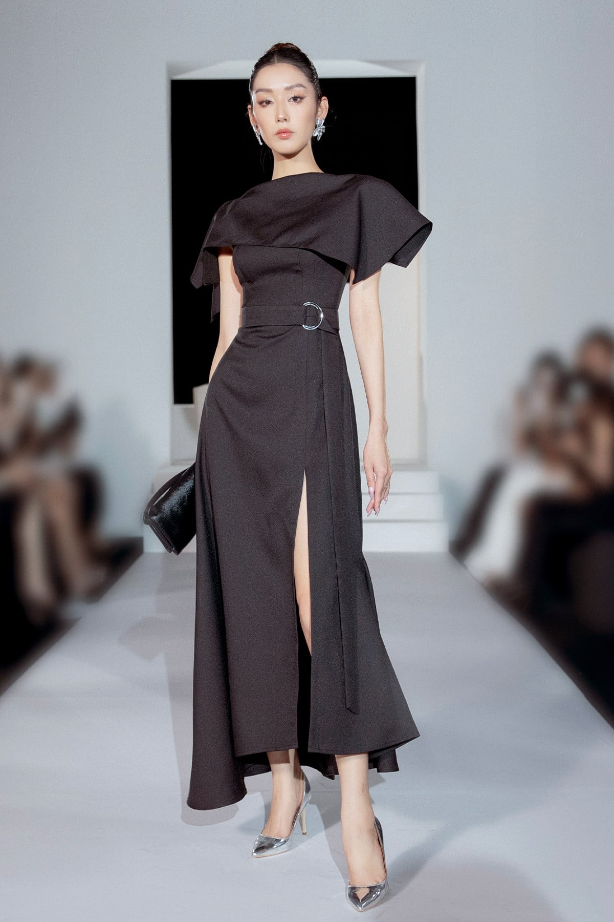 Thiết kế đầm dài form đuôi cá với chi tiết xẻ tà tinh tế. Điểm nhấn ở phần cổ dựng xếp nếp tinh tế, tạo thành một khối bất đối xứng. Thắt lưng rời cùng chất liệu với chi tiết mặt thắt lưng kim loại làm nổi bật vẻ đẹp sang trọng và đẳng cấp của chiếc đầm.