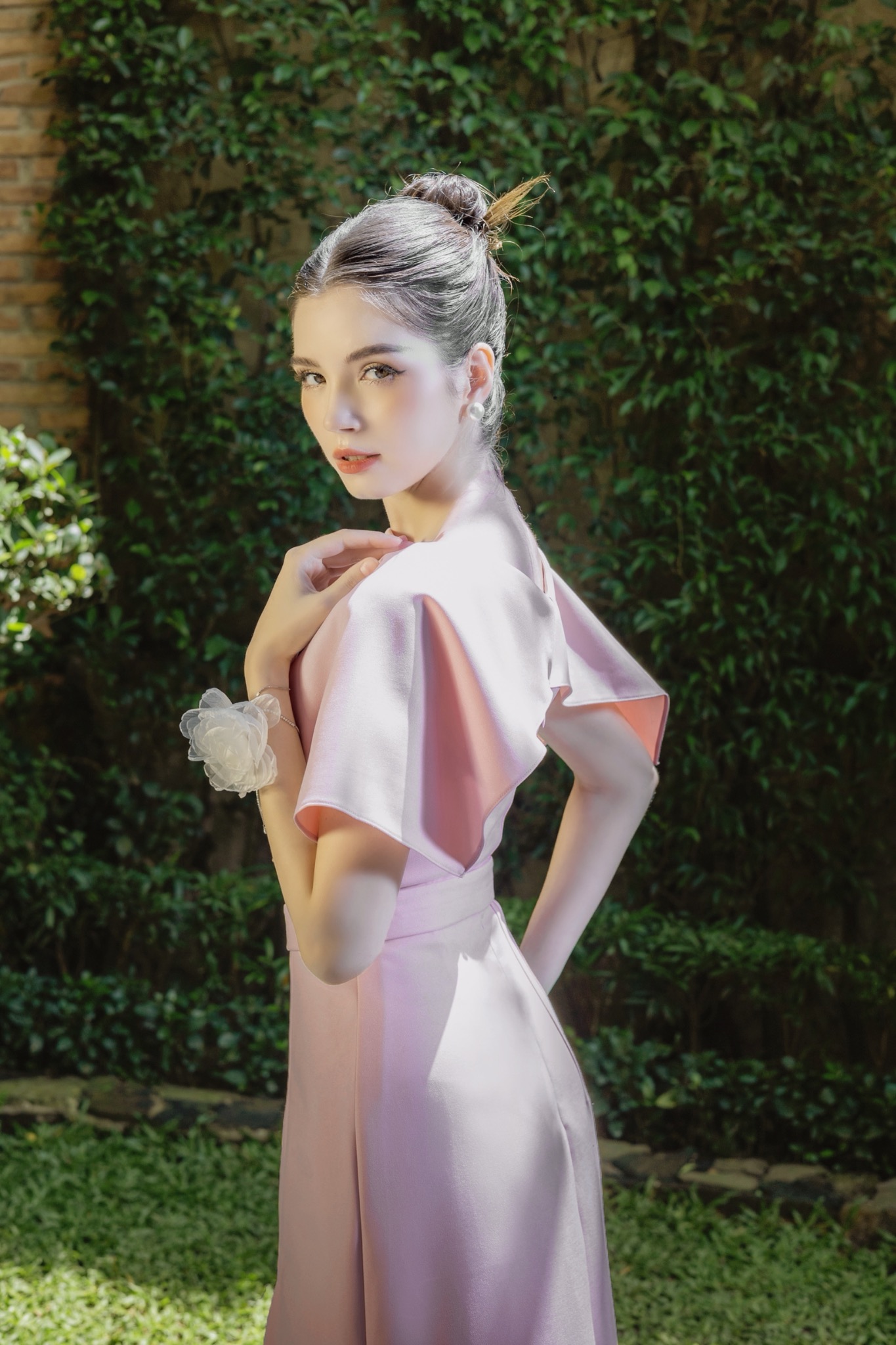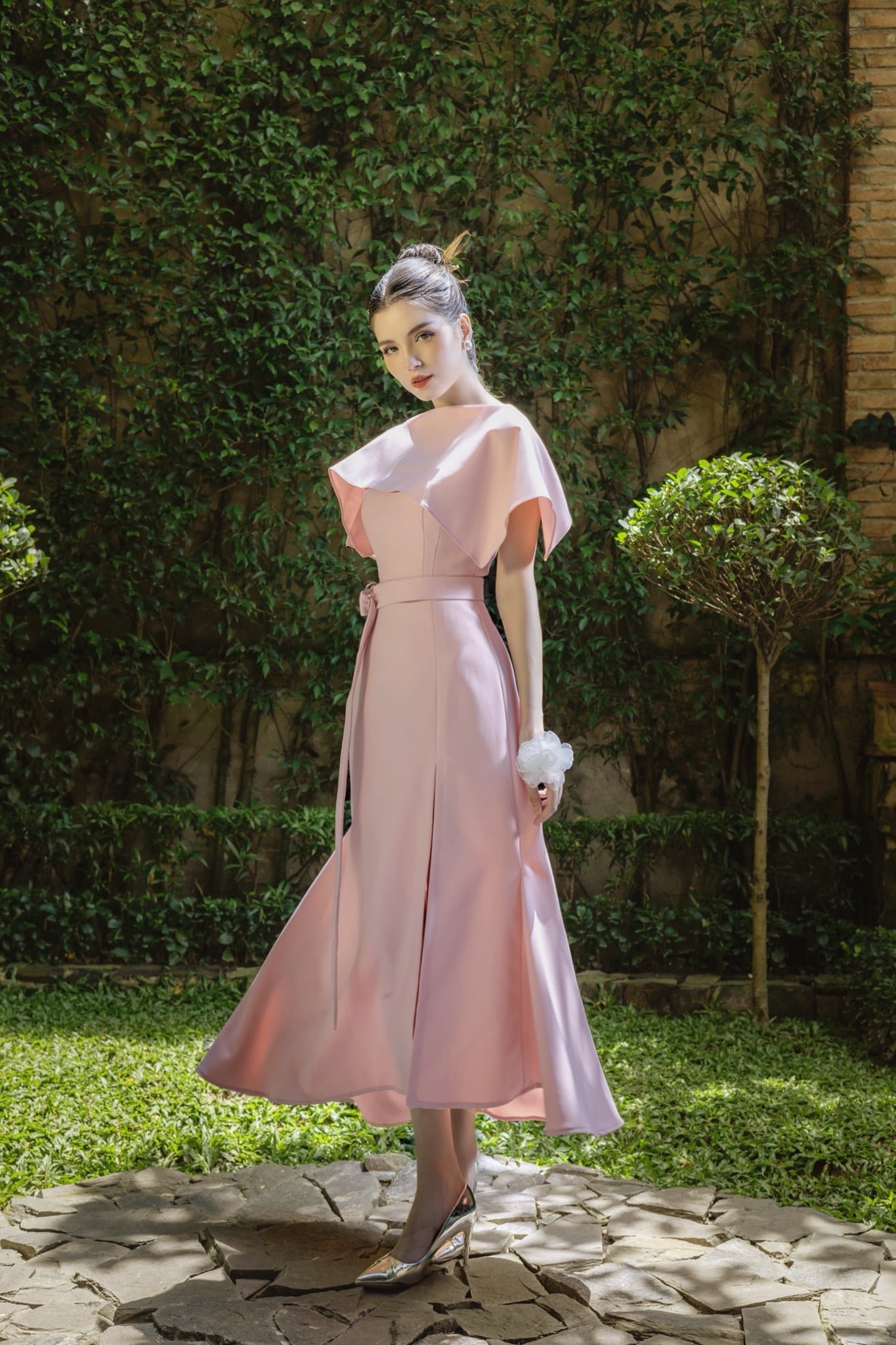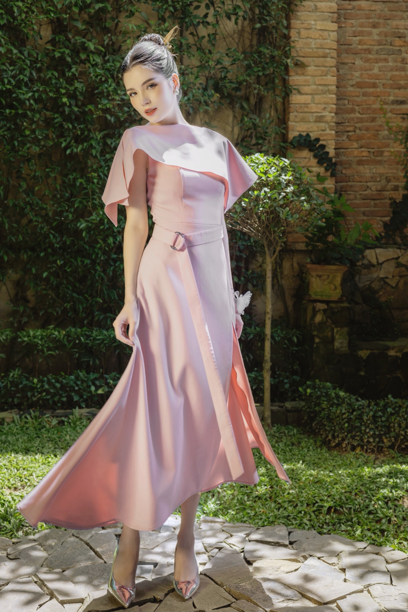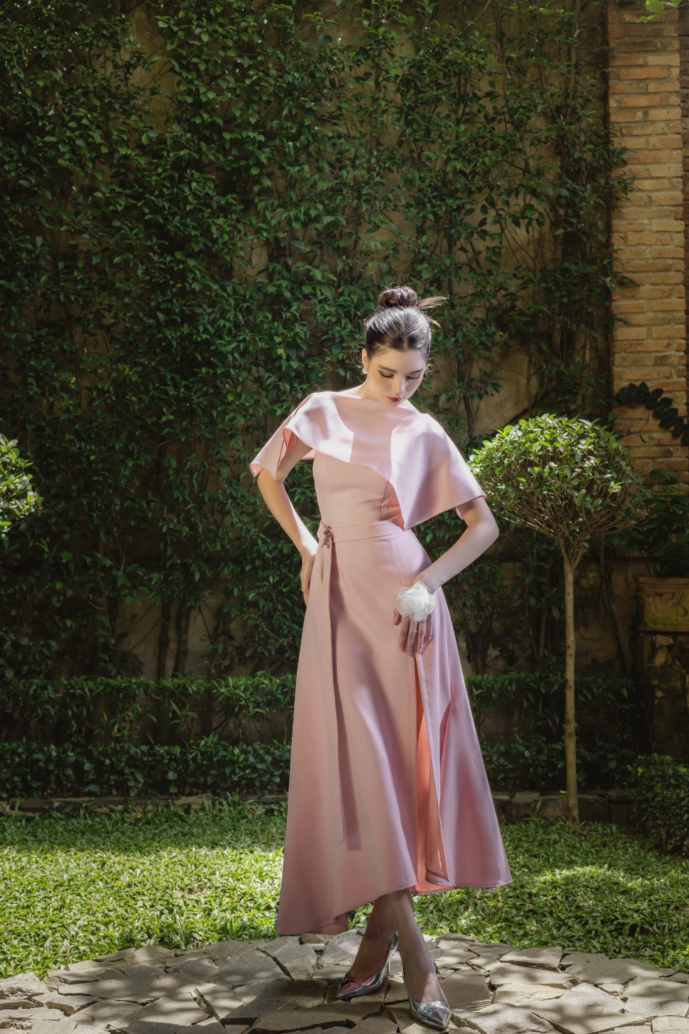 Thiết kế đầm dài form đuôi cá với chi tiết xẻ tà tinh tế. Điểm nhấn ở phần cổ dựng xếp nếp tinh tế, tạo thành một khối bất đối xứng. Thắt lưng rời cùng chất liệu với chi tiết mặt thắt lưng kim loại làm nổi bật vẻ đẹp sang trọng và đẳng cấp của chiếc đầm.