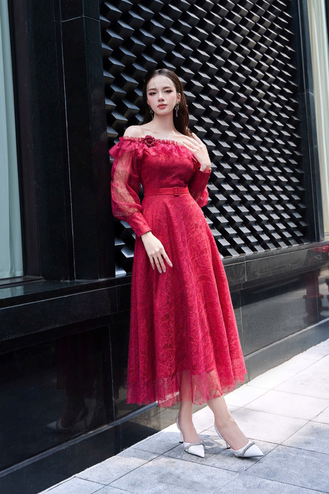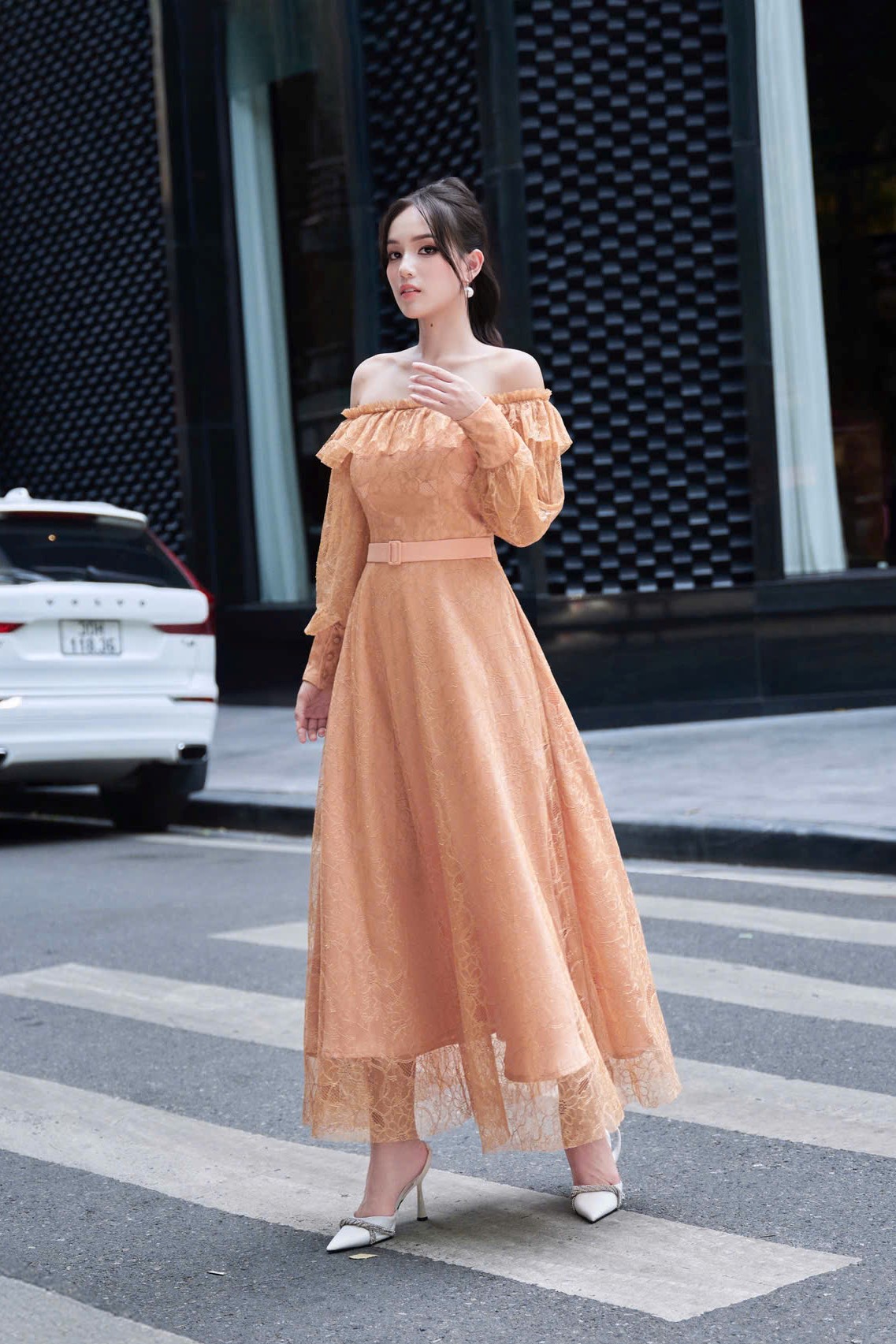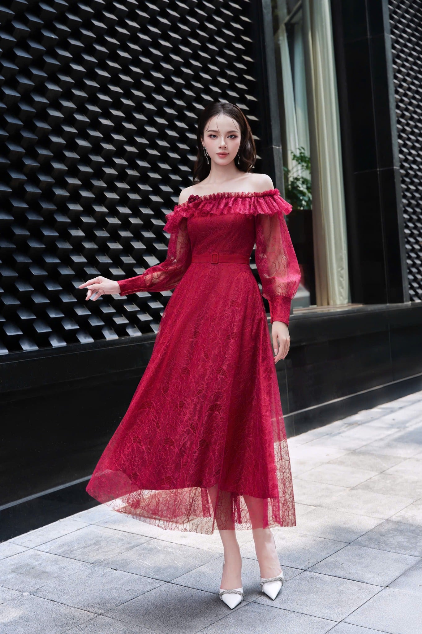 Đầm ren tay dài trễ vai phối dáng dài