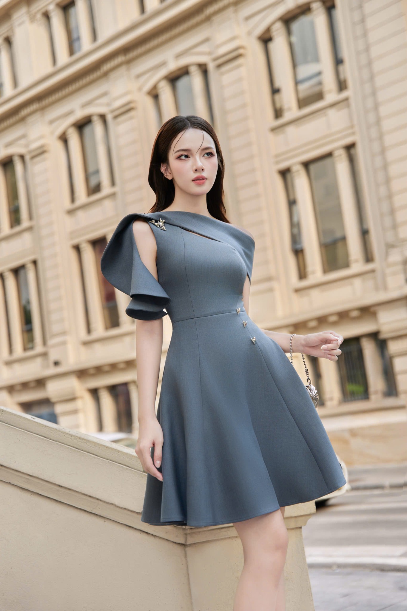 Thiết kế đầm dáng ngắn form xòe được tạo hình từ kỹ thuật ghép 7 mảnh chất liệu vải xước hàn dày dặn tôn dáng mà vẫn che khyết điểm, dải bèo rời linh động vừa có thể phối trở thành choàng vai thanh lịch, vừa làm thắt lưng vải váy đính vào eo.