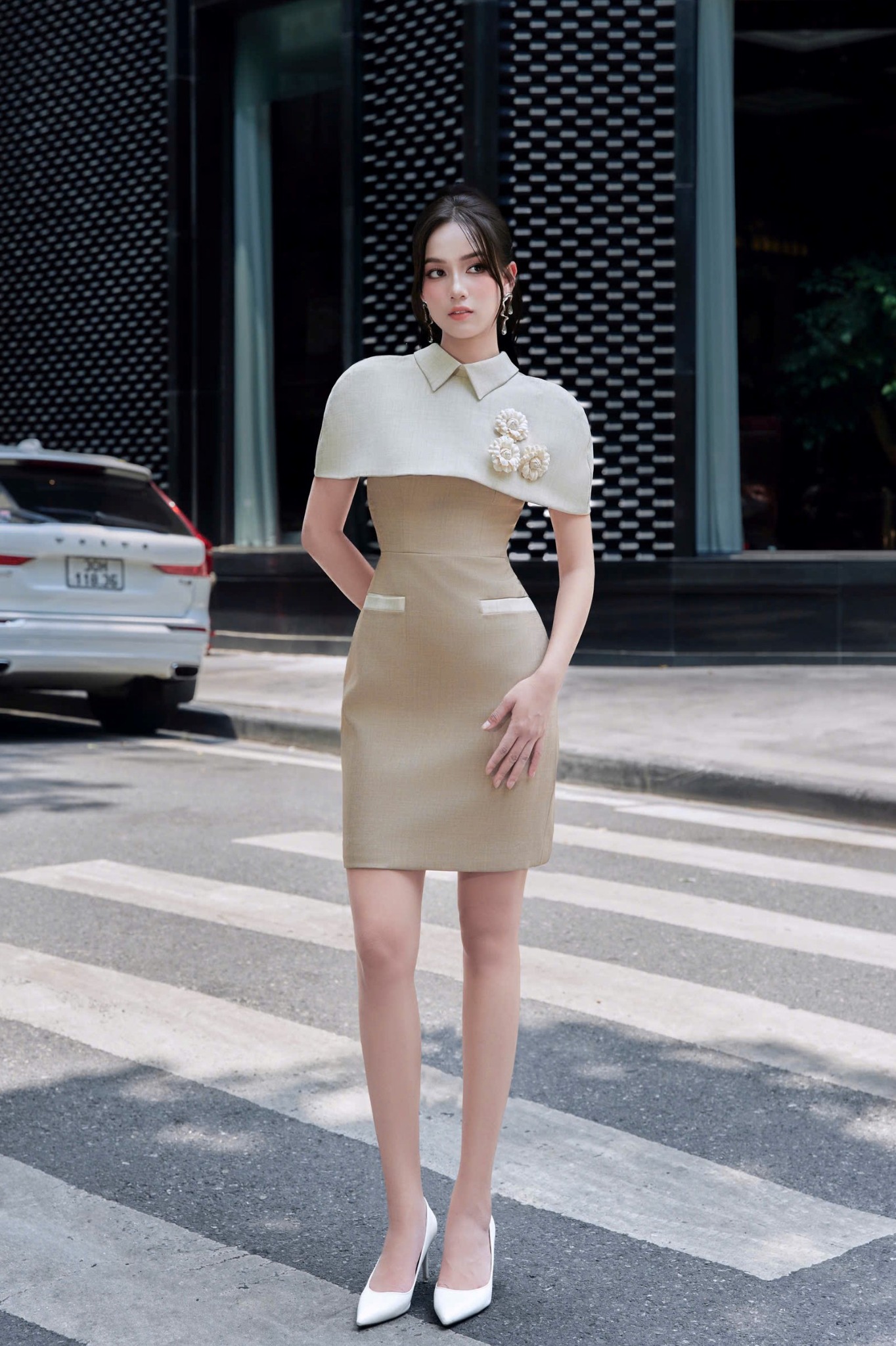 Thiết kế đầm bút chì dáng ngắn, cổ tròn không tay, được tạo hình đứng form tôn dáng sắc nét từ chất liệu vải xước hàn dày dặn và che khyết điểm, điểm nhấn choàng vai cổ đức thanh lịch tuyệt đối