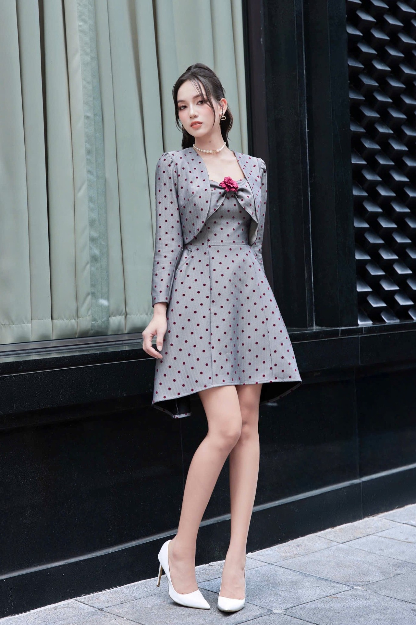 Thiết kế đầm 2 dây bảng lớn, dáng ngắn xòe được tạo hình từ kỹ thuật ghép 7 mảnh, đứng form tôn dáng sắc nét từ chất liệu vải xước nổi bật với họa tiết chấm bi nhuyễn, điểm xuyết đính nơ lớn phần ngực áo.
