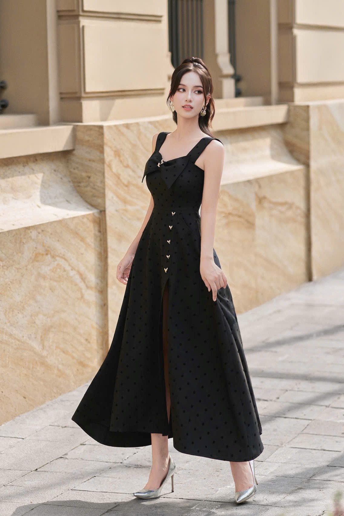 Thiết kế đầm 2 dây bảng lớn, dáng dài xòe đứng form tôn dáng sắc nét từ chất liệu vải xước nổi bật với họa tiết chấm bi nhuyễn, điểm xuyết đính nơ lớn phần ngực áo.